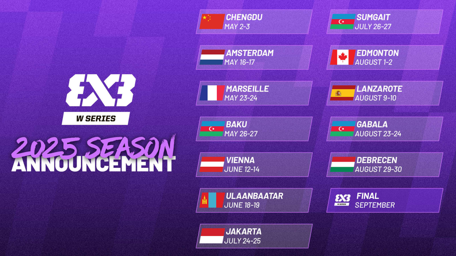 « La FIBA 3×3 Women’s Series s’est imposée comme la première compétition mondiale de 3×3 féminin », a déclaré Alex Sanchez, directeur général de la FIBA 3×3. « Cela s’inscrit dans l’engagement de la FIBA envers l’une de ses principales priorités stratégiques, les femmes dans le basketball, et l’importance d’offrir à toutes les joueuses des opportunités de développer leur jeu à l’échelle mondiale. Nous sommes impatients d’apporter l’atmosphère d’un festival de sports urbains dans 13 villes du centre-ville sur trois continents, créant ainsi des souvenirs durables pour les joueuses et les fans. »